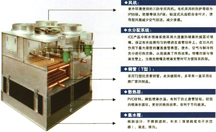 特點:噴淋水的流向(由上向下):噴淋水由盤管冷卻器上部的噴淋管噴出,然后流經盤管冷卻器吸收熱量后滴落到冷卻塔集水槽中供下一次循環使用。