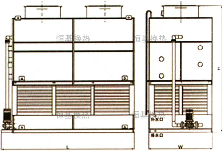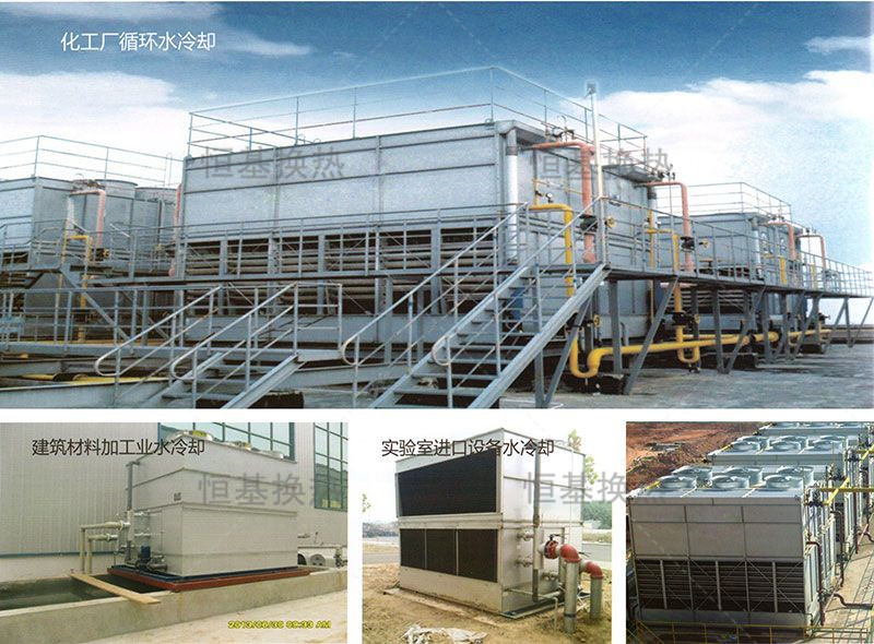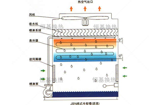 風冷部分:工作流體(軟水或其他液體)在閉式橫流冷卻塔的盤管循環,流體熱量被盤管的管壁吸收后,通過冷卻器上側部的風機把管壁的熱量排出機外。特點:風的流向(由上向下再經側面向上):風由盤管冷卻器上部的一面進風口進入,然后流經盤管冷卻器吸收熱量后,由冷卻器下部流經側面向上排到冷卻塔上方空氣中。
